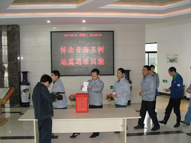 2010年4月14日青海玉樹發(fā)生里氏7.1級(jí)地震,災(zāi)區(qū)的信息牽動(dòng)著公司每個(gè)員工的心,公司員工陸續(xù)通過各種方式向地震災(zāi)區(qū)表達(dá)自己的一份心意。4月21日舉國(guó)哀悼,下午4:00,公司組織員工對(duì)青海玉樹的同胞們進(jìn)行捐款,捐款前公司員工對(duì)地震中的遇難者進(jìn)行默哀。共有326人參與本次活動(dòng),所得善款共計(jì)15885元,善款將通過銅陵市紅十字會(huì)送達(dá)災(zāi)區(qū)。